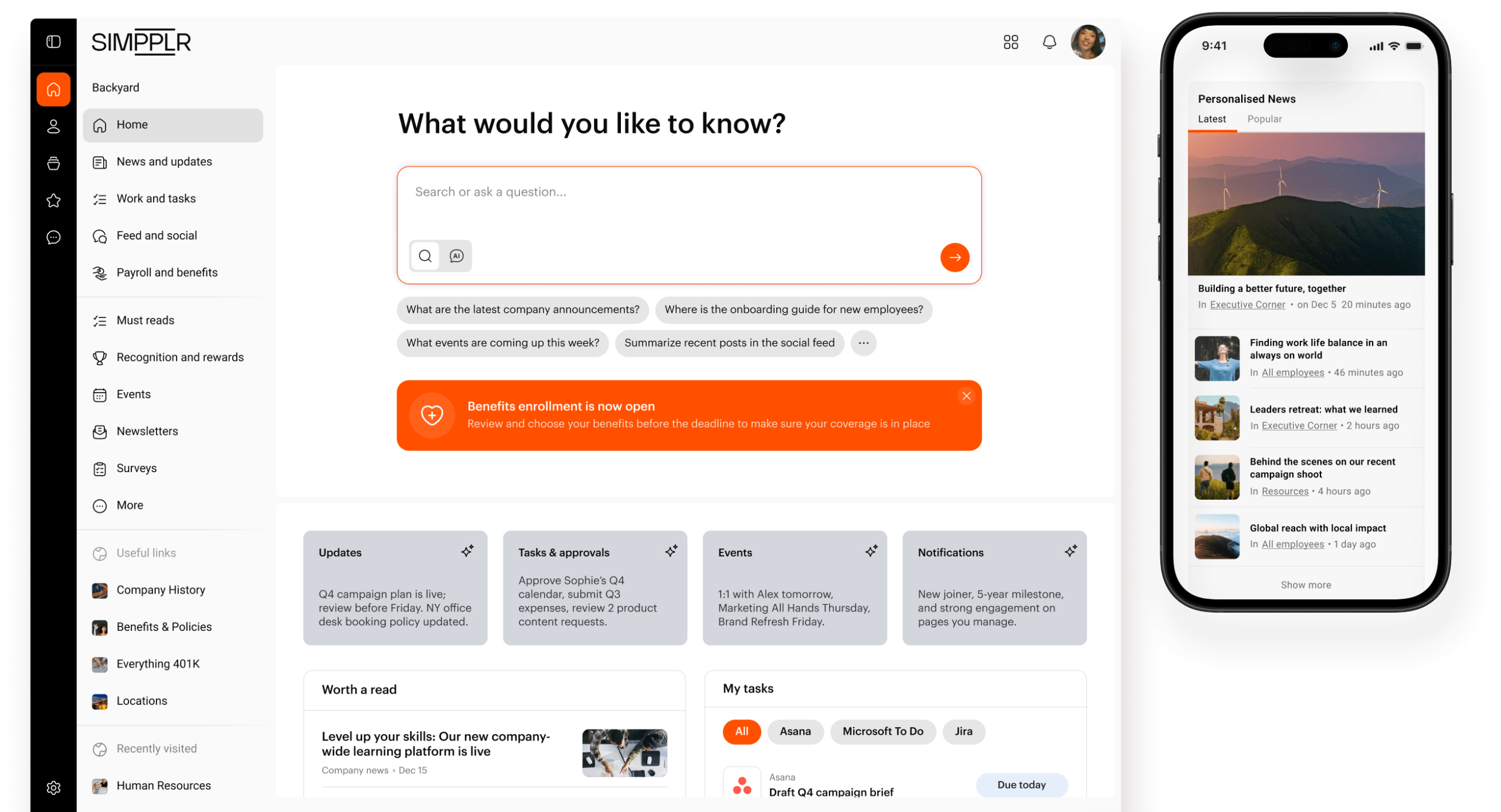 Simpplr AI-powered intranet dashboard with a desktop and mobile view.