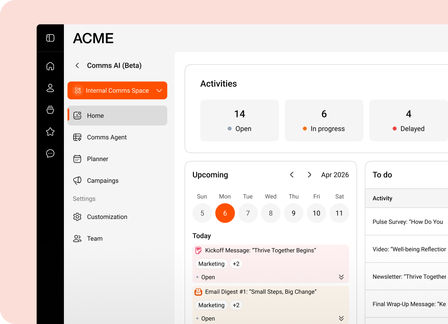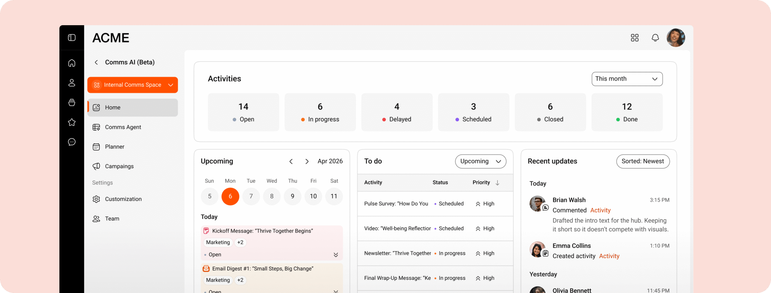 Generate on-brand drafts, align stakeholders inside the workflow, and coordinate delivery across channels without losing track of what’s planned, in progress, or already live.