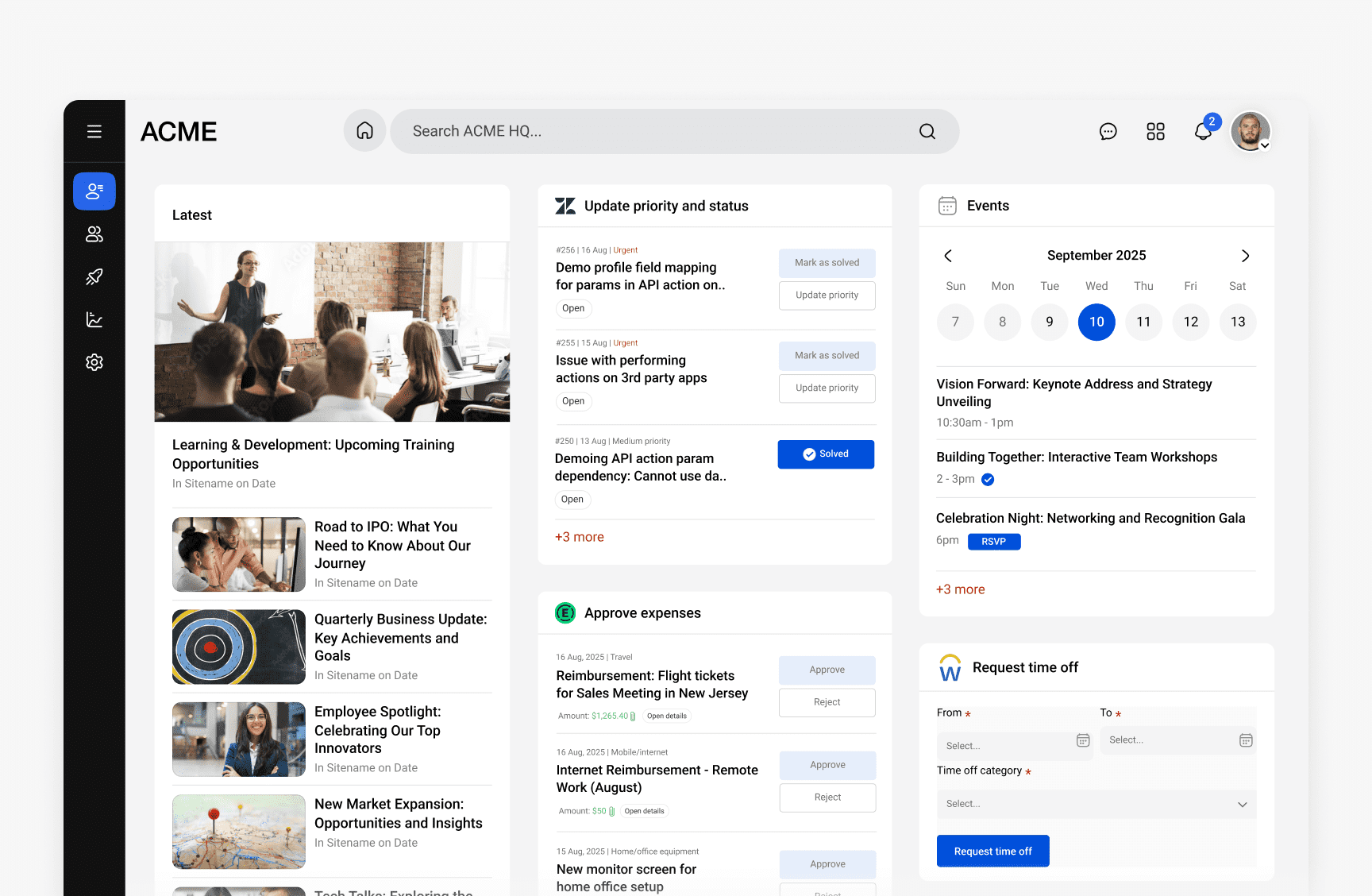 App tiles just got an upgrade. They don’t just show information — they let employees take action right where they are. Approve an expense report in Concur, update that pesky Zendesk ticket, check off a task in Asana, RSVP to the next company off-site, and more — all in the same place you saw the update.