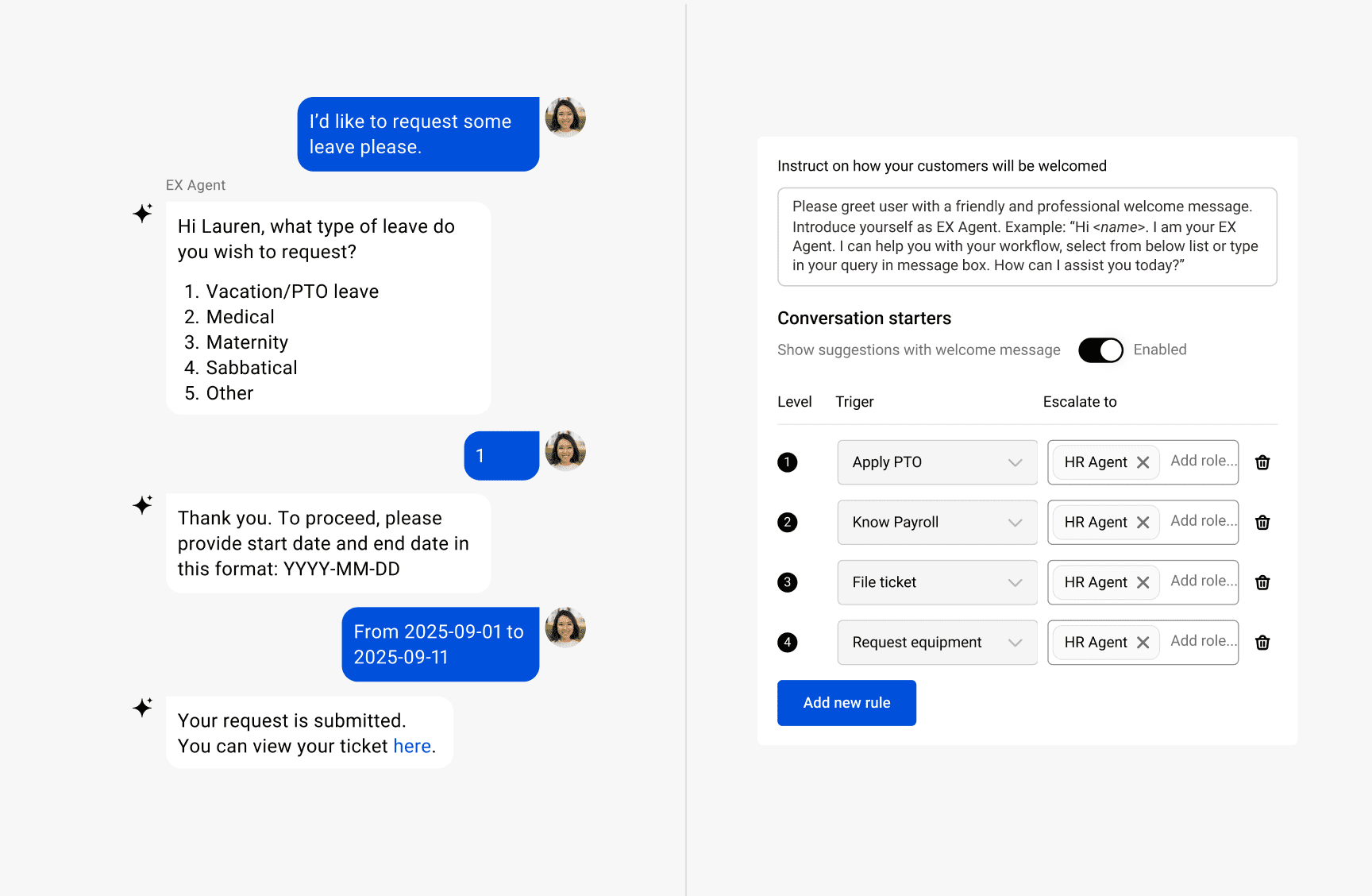 A single conversational interface where employees can ask questions, complete tasks, and get personalized support, whether it’s booking the conference room with the good chairs or resetting that password (again).