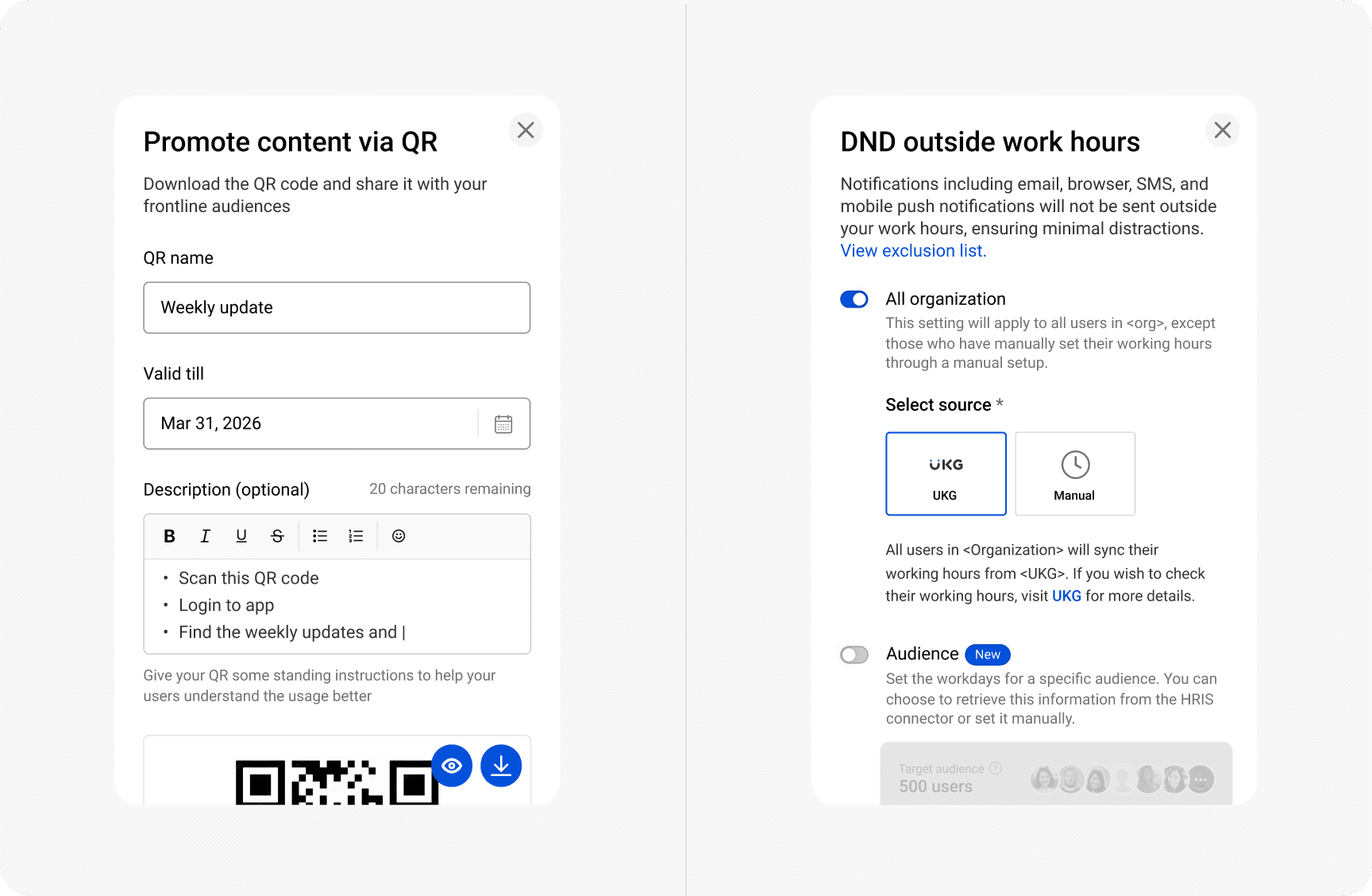 With Do Not Disturb mode, set default working hours to pause nonessential notifications off-shift. You can also now create QR codes directly from the platform — perfect for posters, signage, or email — to link frontline employees straight to the mobile app or content.